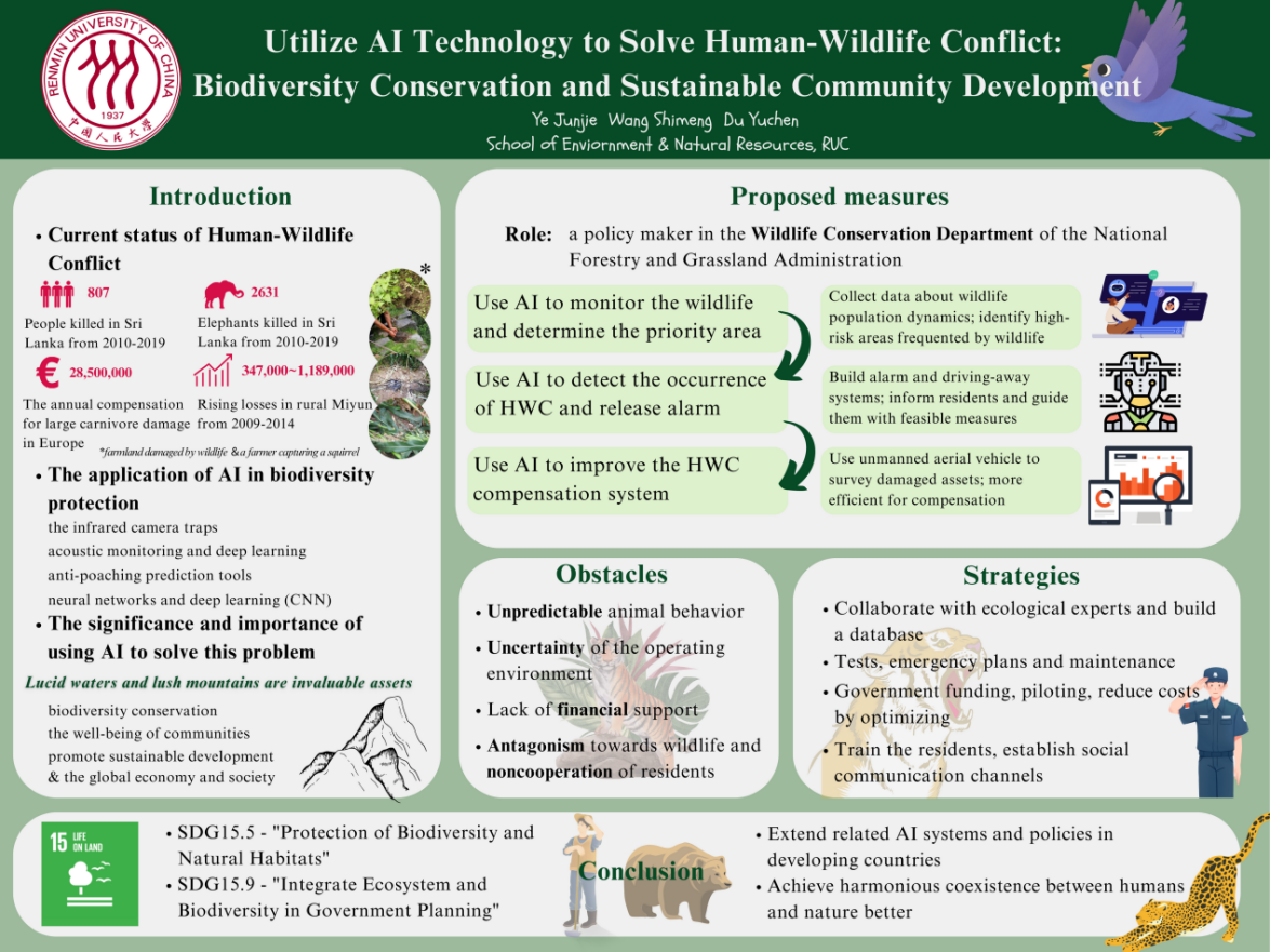 本届“明德立言”高校青年国际胜任力大赛围绕主题“Technology for a better future”展开。在加拿大28预测 孟秀祥教授和研究生路晓平、吴佳忆、周鑫的指导下,Fly Away Home队围绕规定议题“Achieving environmental sustainability and biodiversity with artificial intelligence (AI) technology”,以提案“Utilize AI technology to solve Human-Wildlife Conflict: Biodiversity conservation and sustainable community development”和学术海报的形式,进行了议题分析。