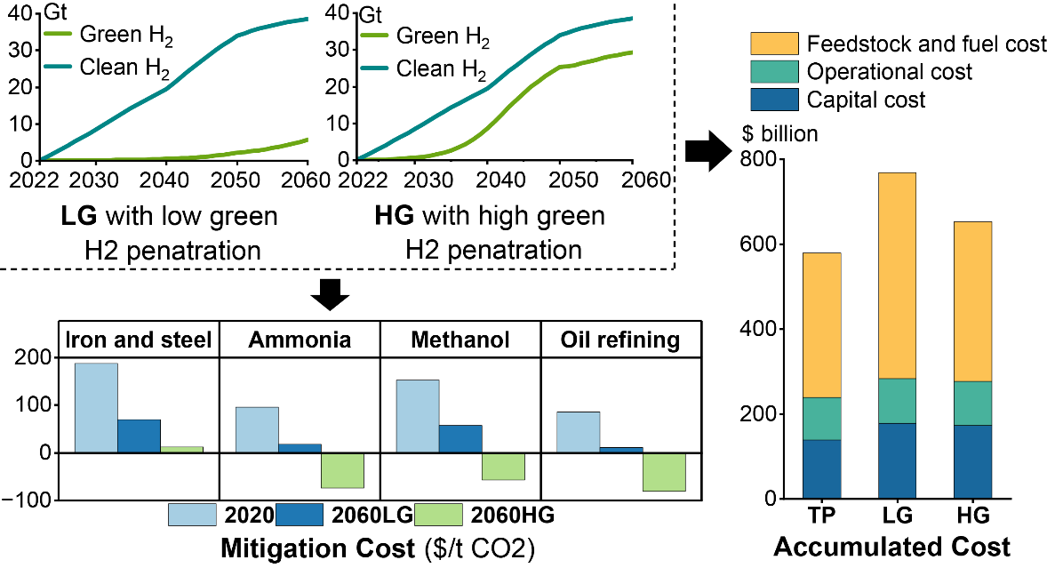 Abstract: Clean hydrogen, including green and blue hydrogen, presents a promising option to decarbonize hard-to-abate (HTA) industries. However, the focus on the diffusion pathways for blue and green hydrogen and cross-sector comparisons is limited. Therefore, a bottom-up techno-economic assessment model is established for four Chinese HTA industries that consider hydrogen demand and supply sides. An S-shaped growth curve is used to simulate the possible clean hydrogen supply paths with various blue and green hydrogen mix structures. Two pathway scenarios with different mixtures of clean hydrogen are developed. Despite similar mitigation potential, the green hydrogen-dominant pathway exhibits superior economic performance than the blue hydrogen-dominant pathway. It saves $115.5 billion compared to the blue hydrogen-dominant scenario and incurs only an additional $73.7 billion in total costs compared to a traditional technology pathway. Clean hydrogen utilization in the iron and steel industry requires significant technology investments from both the supply and demand sides. In contrast, the methanol, ammonia, and oil refining industries primarily incur hydrogen supply costs, with minimal demand-side investment needs, leading to greater mid- to long-term economic advantages and lower mitigation costs as technology advances. These comprehensive and dynamic comparisons of techno-economic performance aid in industry-specific policy-making.