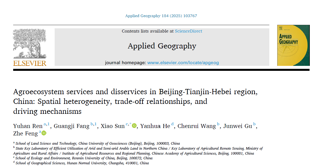 近日,分分28预测 孙晓副教授作为唯一通讯作者,与合作者的研究论文“Agroecosystem services and disservices in Beijing-Tianjin-Hebei region, China: Spatial heterogeneity, trade-off relationships, and driving mechanisms”在地球科学研究领域国际知名期刊Applied Geography发表。