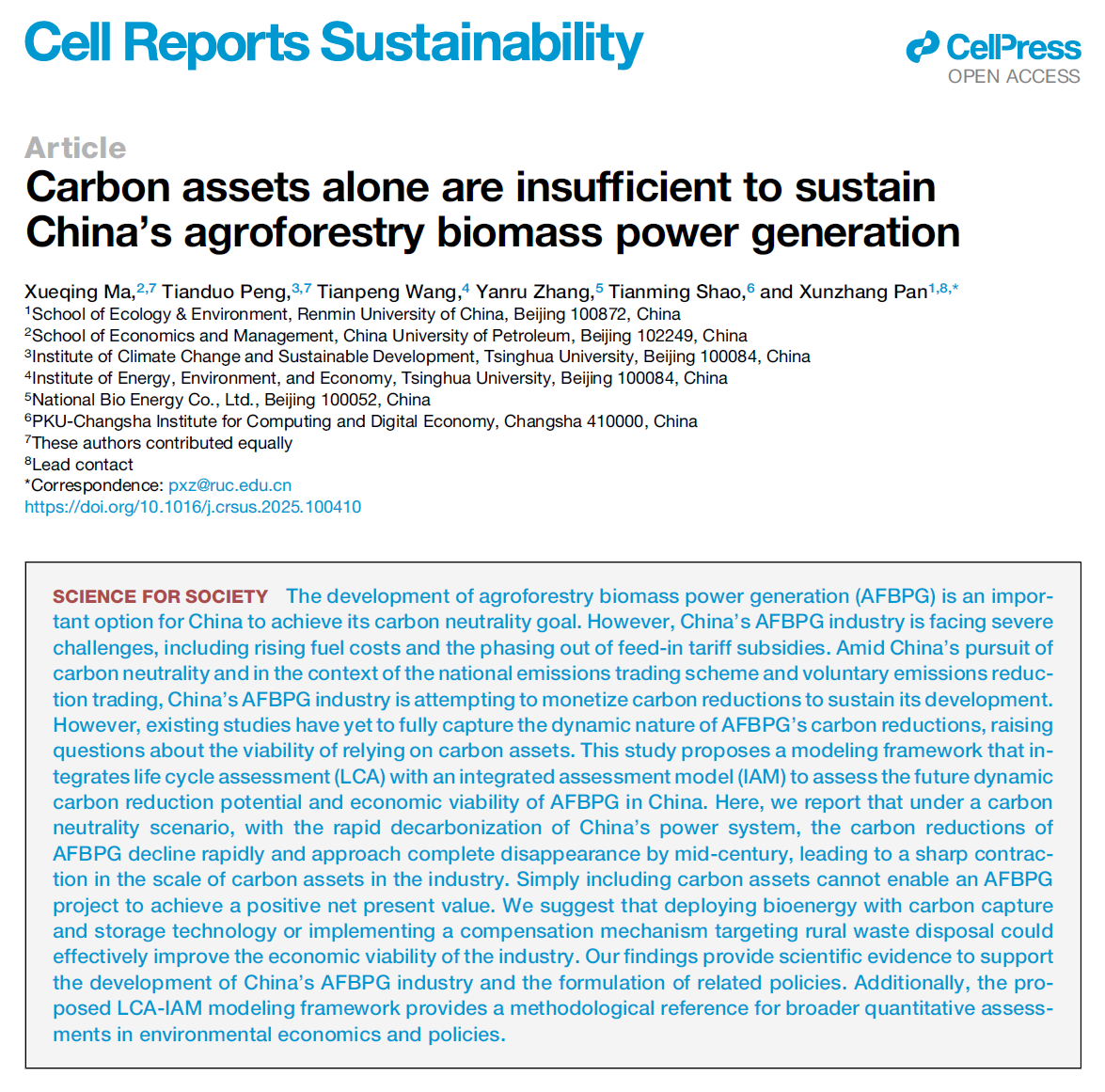 近日,分分28预测 “气候治理大数据与政策模拟实验室”主任潘勋章副教授作为独立通讯作者,与合作者的研究论文Carbon assets alone are insufficient to sustain China’s agroforestry biomass power generation在Cell子刊Cell Reports Sustainability发表。