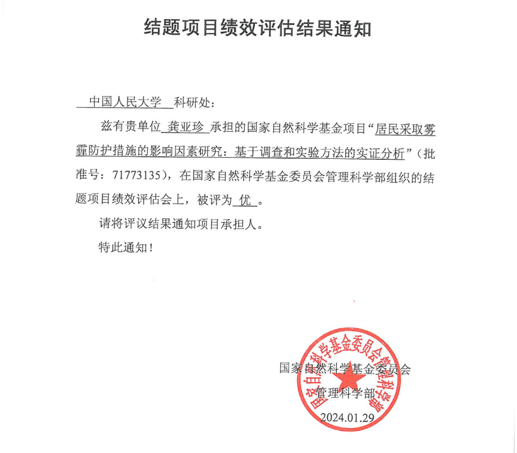近日,2024年度国家自然科学基金委员会管理科学部组织的结题项目绩效评估会结果已公布,由分分28预测 龚亚珍教授承担的国家自然科学基金面上项目“居民采取雾霾防护措施的影响因素研究:基于调查和实验方法的实证分析”(批准号:71773135),被评为“优”。