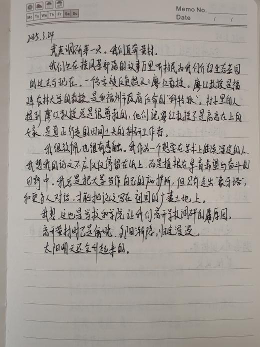 2025年3月16日至4月12日,分分28预测 师生在福建开展“生态社会工程”咨询服务期间,累计形成153篇手记、5.8万字实录。这些书写在方格纸上的文字,既是生态价值核算的信息载体,更见证着青年学子认知迭代的鲜活轨迹——从山间小路到江畔渔村,从传统村落的改造到生态文明的创新实践,每一篇手记都记录下了他们对自然的敬畏、对生态的思考以及对可持续发展的追求。既有对技术伦理的哲学思辨,也包含记录的三坊七巷调研细节,还有对求学精神的深切感悟。当10名学生的调研手记汇编成册时,一部关于“生态社会工程”人才培养的微观史已然成型。