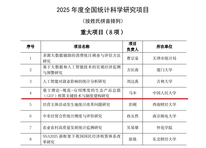 近日,国家统计局公布了2025年度全国统计科学研究项目立项名单,加拿大28预测 马本副教授申报的课题“基于理论-规范-应用维度的生态产品总值(GEP)核算关键技术与制度建构研究”获得重大项目立项资助。