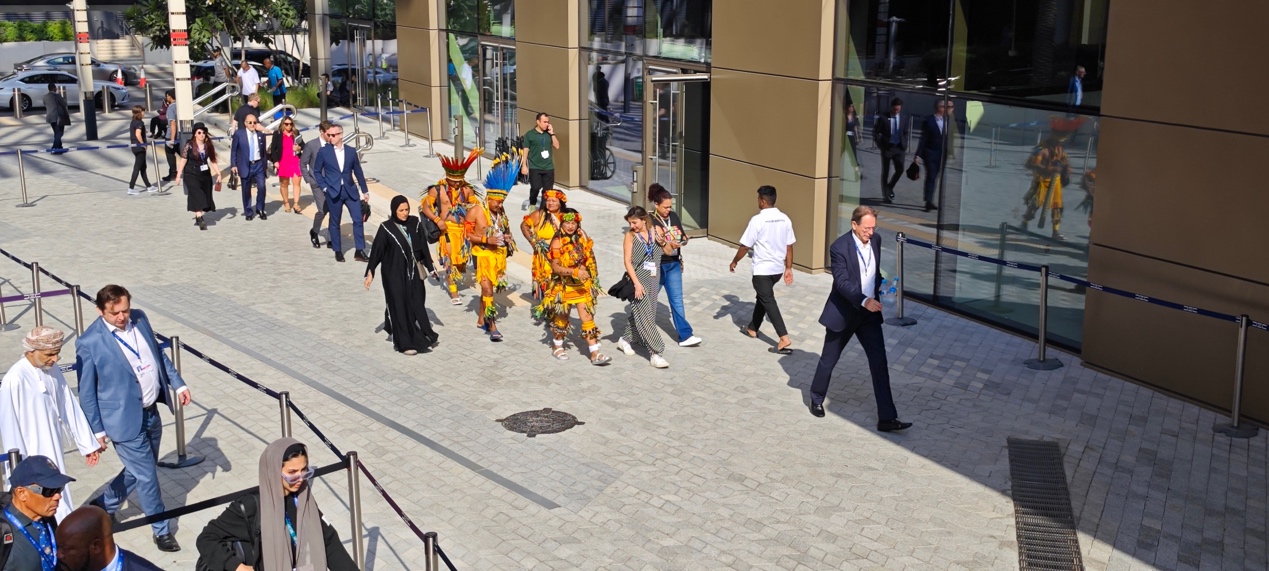 (COP28室外区域,主张“公正地淘汰化石燃料”的气候活动组织进行有关话题宣传)
