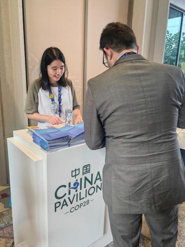 12月3日是蓝区中国角开幕后正式面向全体代表开放的第一天,应民间冰川监测组织“极地未来”和广东省生态环境厅代表团的邀请,我们从当日下午2:30开始协助上述两个组织承办的中国角边会工作。我们负责为对边会感兴趣的代表们分发宣传材料、纪念品及传译工具等,并向他们介绍边会内容和日程安排、邀请他们进入中国角听会、回答他们关于中国角和中国气候行动的各种问题。