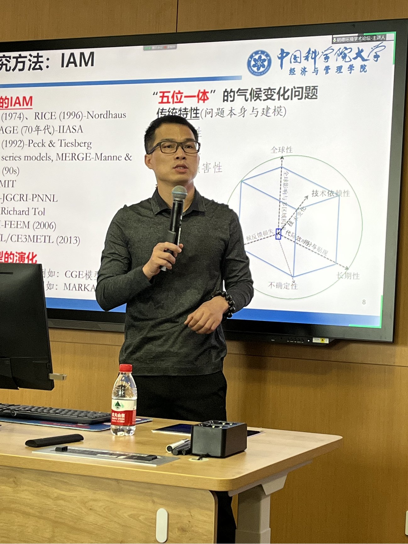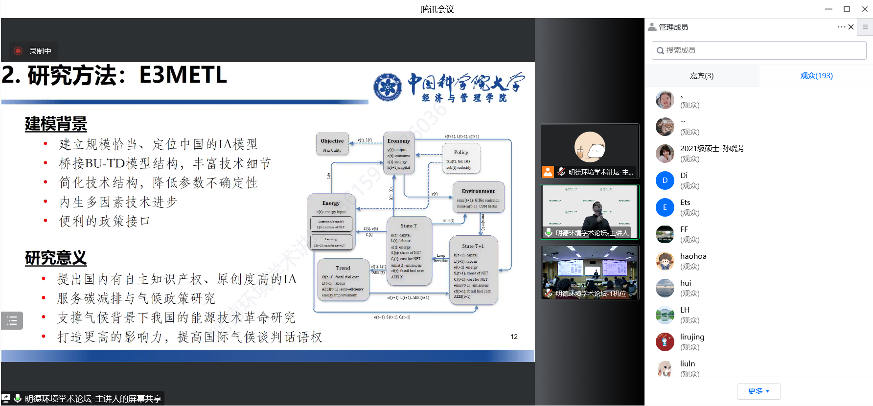 在深入讲述研究成果之前,段宏波教授简要描述了中国平均气温上升、海平面上升和在第七十五届联合国大会上承诺努力争取2060年前实现碳中和目标的背景,梳理和对比了以气候变化综合评估模型(IAM)为代表的系列能源-经济-环境(3E)集成模型,介绍了与合作者开发构建的包含宏观经济、能源技术和气候三个模块的E3METL模型。