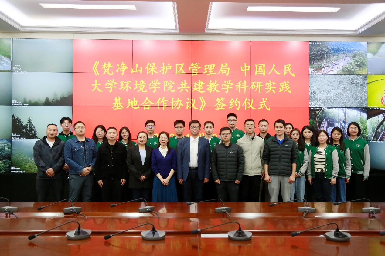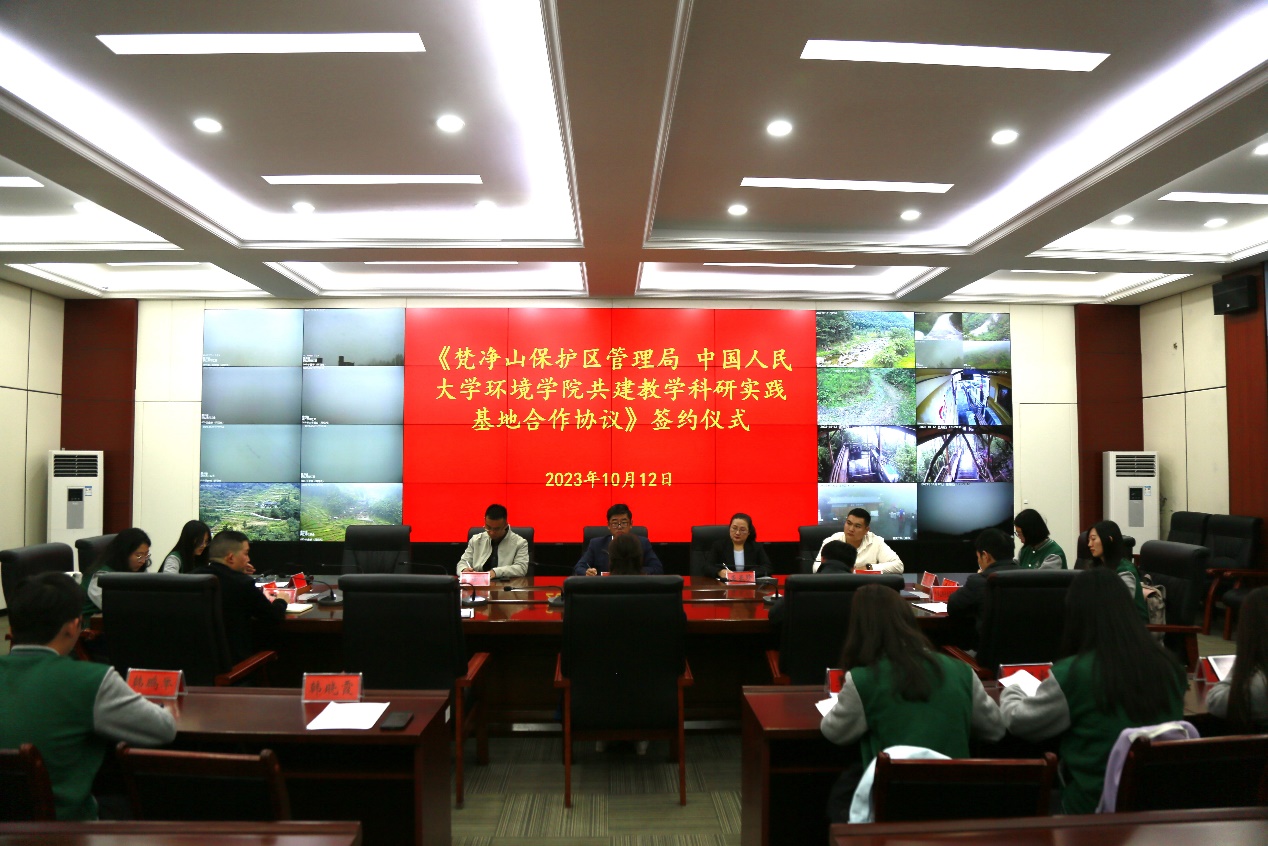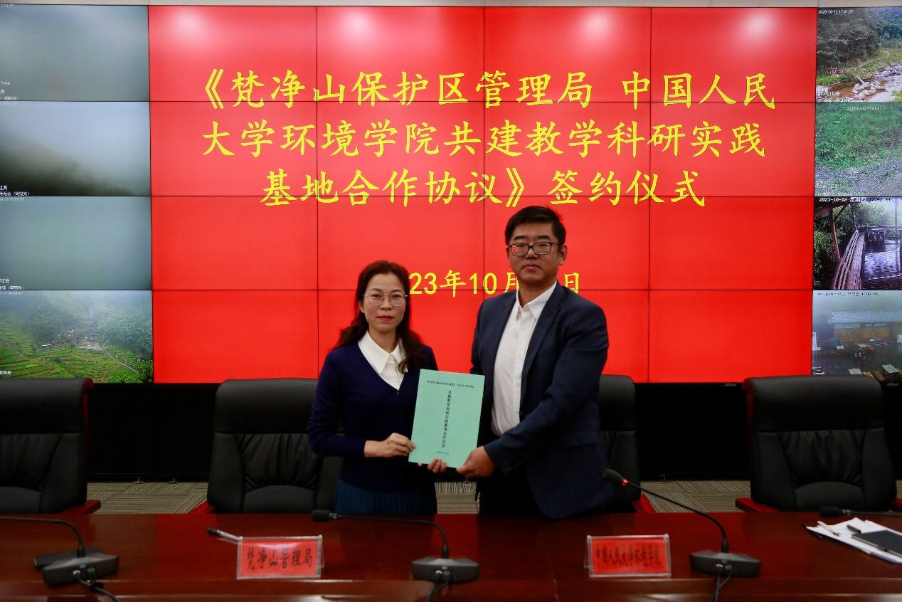 最后,调研团队与梵净山管理局领导在梵净山管控平台开展了“梵净山保护区管理局 中国人民大学环境分分28预测 共建教学科研实践基地合作协议”签约座谈会。中国人民大学环境分分28预测 党委书记贾铁英老师和梵净山管理局杨妮副局长代表双方签订了合作协议,双方在生态文明建设领域的教学实践、人才培养与科研交流等方面达成战略合作。调研团队师生和梵净山管理局工作人员关于梵净山自然保护区的保护现状、管理体系、规章制度、生态旅游、社区工作、科研工作等多方面内容进行了交流讨论。