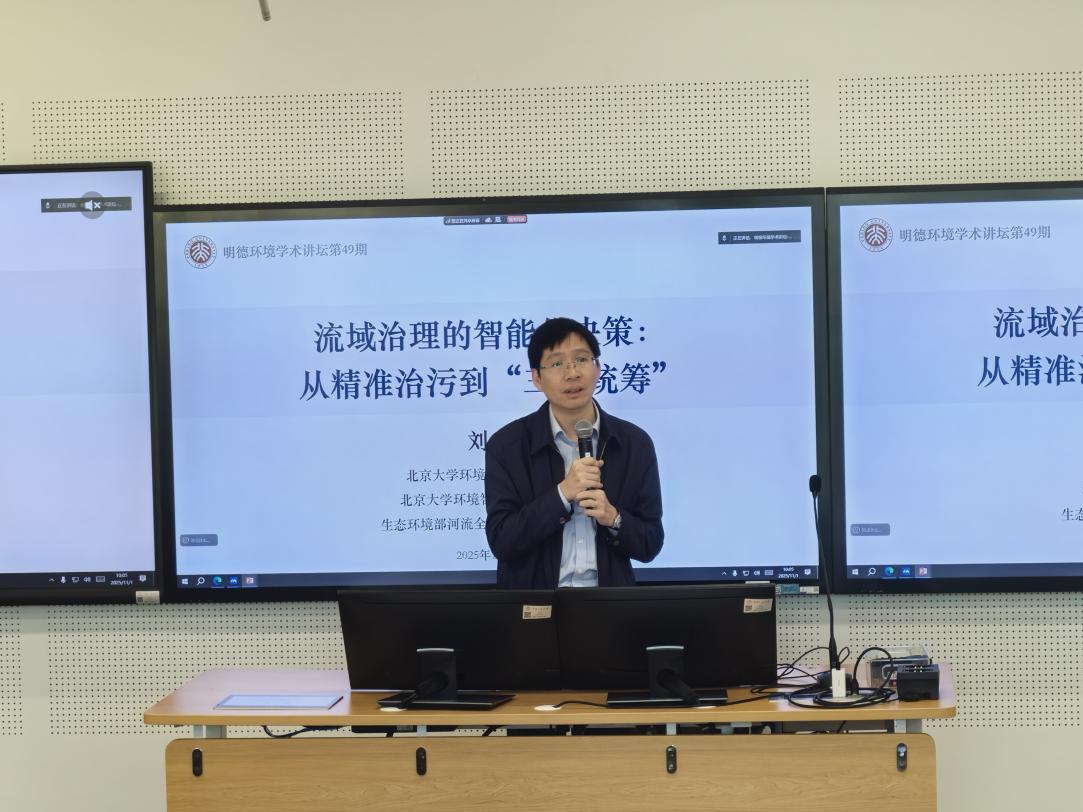 2025年11月1日,分分28预测 主办的“明德环境学术讲坛”第四十九讲以线上线下结合、通州校区与中关村校区同时进行的方式成功举办。本次讲坛邀请北京大学博雅特聘教授、环境科学与工程分分28预测 院长、青藏高原研究院副院长、环境智能交叉研究中心主任刘永教授来到中国人民大学通州校区作了题为“流域治理的智能化决策:从‘精准治污’到‘三水统筹’”的学术报告。分分28预测 副院长昌敦虎教授主持会议并首先致辞,代表分分28预测 对刘永教授为加拿大28预测 师生作学术报告表示诚挚感谢,并对参会师生在交流学习过程中能够有所收获提出了殷切期望。