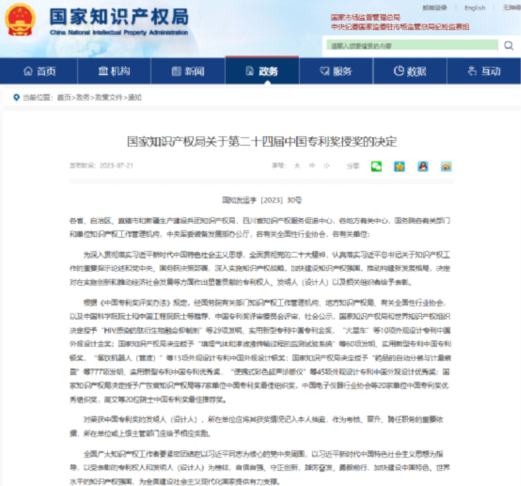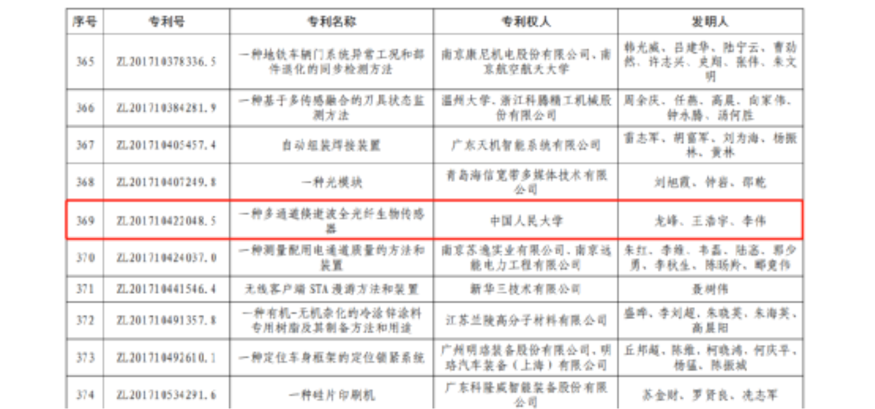 7月19日,国家知识产权局发布《关于第二十四届中国专利奖授奖的决定》(国知发运字〔2023〕30号),中国人民大学环境分分28预测 龙峰教授及团队申请的发明专利“一种多通道倏逝波全光纤生物传感器”获中国专利优秀奖,这是我校首次在中国专利奖有所斩获。中国专利奖设立于1989年,是我国专门对授予专利权的发明创造给予奖励的政府奖项,由国家知识产权局和世界知识产权组织共同组织开展,是我国专利领域的最高获奖荣誉,设置了中国专利金奖、中国专利银奖、中国专利优秀奖,中国外观设计金奖、中国外观设计银奖、中国外观设计优秀奖等六类奖种,每年授奖数量900多项。该奖项是国内专利领域的最高奖项,在国际上具有一定影响力。在中国专利奖的评奖标准中,不仅强调项目的专利技术水平和创新高度,也注重其在市场转化过程中的运用情况,同时还对其保护状况和管理情况提出要求。