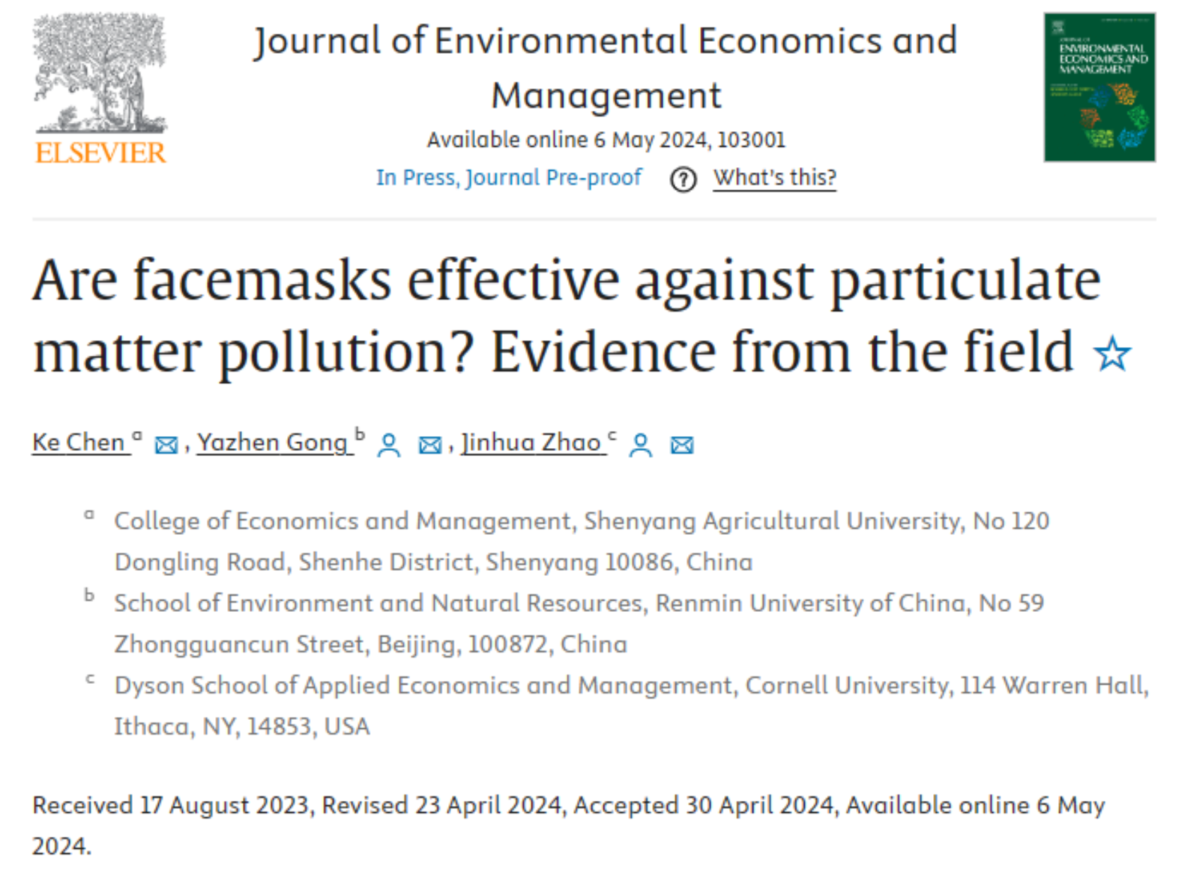 2024年5月6日,分分28预测 龚亚珍教授与其合作者沈阳农业大学陈珂教授和美国康奈尔大学赵金华教授的研究成果“Are facemasks effective against particulate matter pollution? Evidence from the field”在资源与环境经济学领域顶级期刊Journal of Environmental Economics and Management(JEEM)在线发表。三位作者为共同一作,其中龚亚珍教授和赵金华教授为该文章的通讯作者。这是龚亚珍教授第二次在JEEM上发表论文。