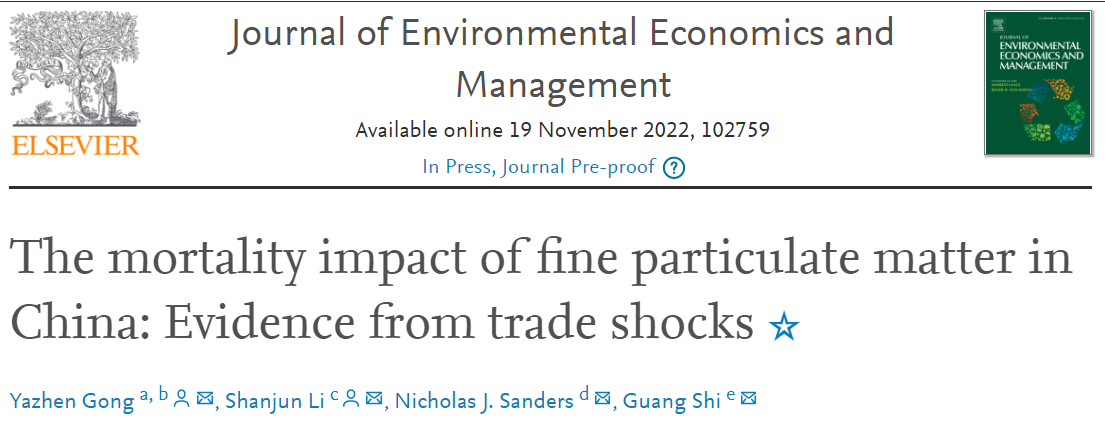 2022年11月19日,中国人民大学环境分分28预测 龚亚珍教授与其合作者的研究成果“The Mortality Impact of Fine Particulate Matter in China: Evidence from Trade Shocks”在资源与环境经济学领域顶级期刊Journal of Environmental Economics and Management(JEEM)在线发表。