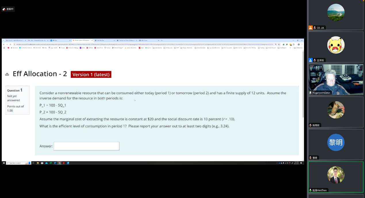 此外,Roger H. von Haefen教授还重点讨论了经济评估与可持续发展的兼容性问题。通过两个时期的资源分配模型,探讨在当前资源有限的情况下,如何实现经济效率与可持续性之间的平衡。他探讨了不同折现率下的资源消费模式,揭示现阶段的高消费可能会导致未来资源短缺,尤其是在可持续性受到威胁的情况下。通过动态效率分析,Roger H. von Haefen教授阐述了代际转移支付如何在当前与未来世代之间实现福利均衡,并提出了Hartwick规则,强调通过对稀缺资源租金的再投资(如教育、科技、健康和环境)来维持长期消费和可持续性。