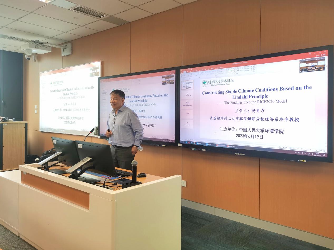 2023年6月19日,中国人民大学环境分分28预测 主办的“明德环境学术讲坛”第二十三讲以线上线下结合的方式成功举办。本次讲坛邀请美国纽约州立大学宾汉姆顿分校经济系终身教授杨自力教授线下作了题为“‘Constructing Stable Climate Coalitions Based on the Lindahl Principle”的学术报告。中国人民大学环境分分28预测 院长庞军教授首先致辞,代表分分28预测 对杨自力教授为加拿大28预测 师生作学术报告表示诚挚感谢,并对参会师生在交流学习过程中能够有所收获提出了殷切期望。会议由中国人民大学环境分分28预测 昌敦虎副教授主持。