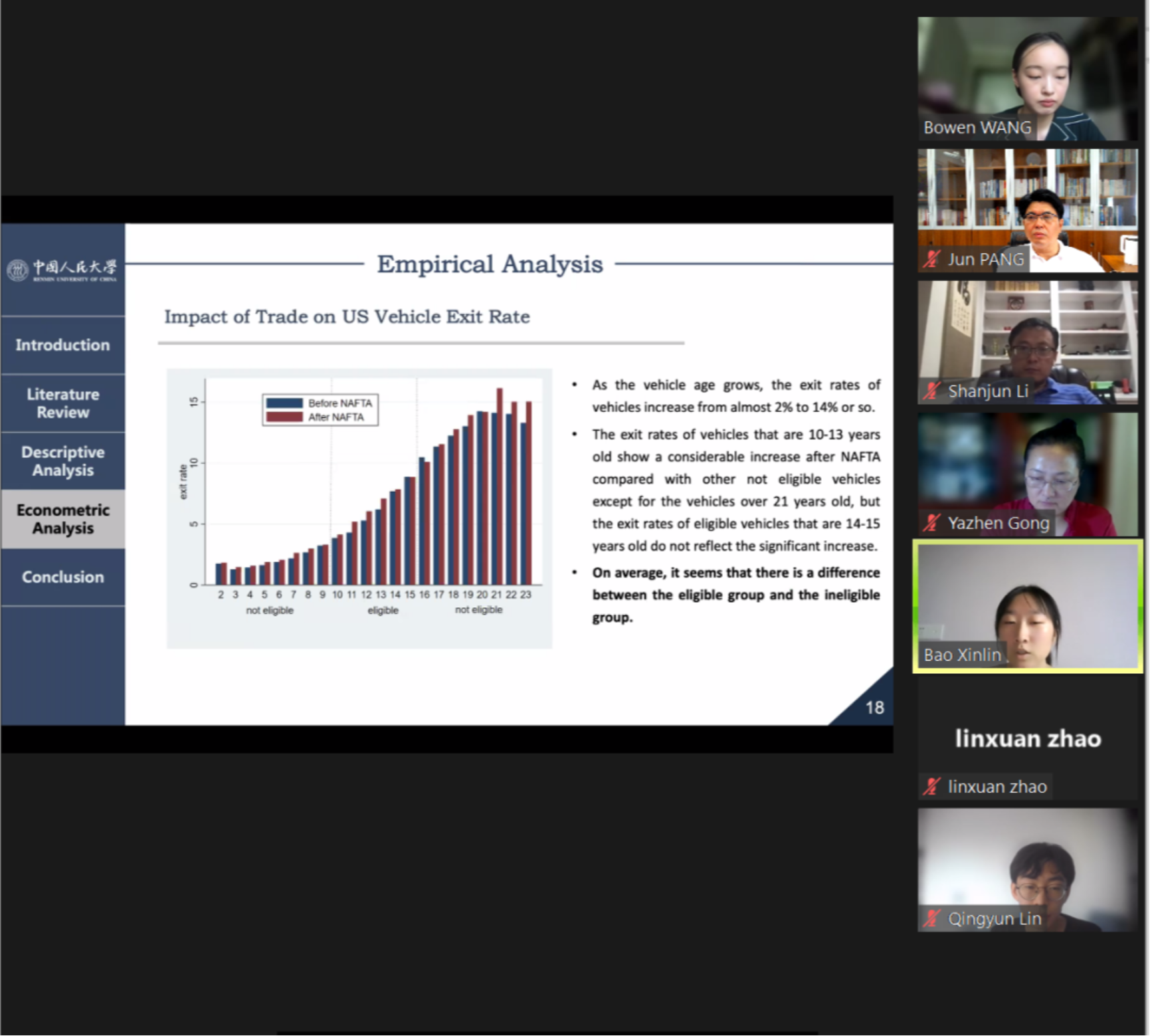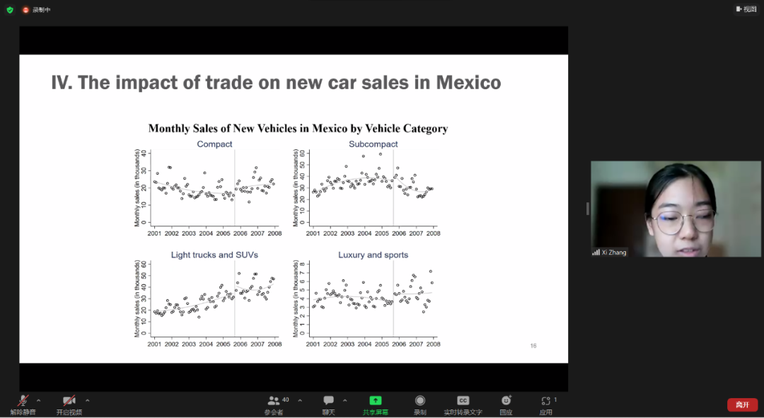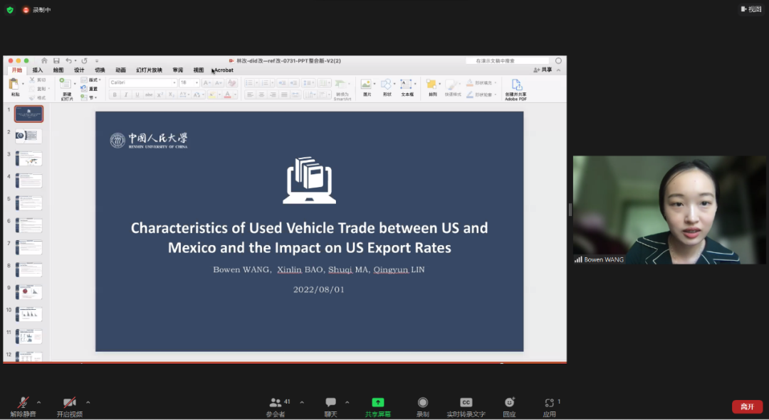 2019级明德环境“经济学-科学”拔尖创新人才实验班33位同学在完成为期两周的“应用微观经济学”与“环境大数据与机器学习”的线上课堂的学习后,分成8组,围绕“美国-墨西哥二手车交易的环境影响”这一主题开展为期两周的实证分析和研究。针对同样的研究题目,各组同学形成各自独特的研究问题。他们精诚合作,充分利用课堂上学到的知识,开展了相关的数据挖掘和实证分析,完成了书面报告,并用英语对研究成果进行汇报。