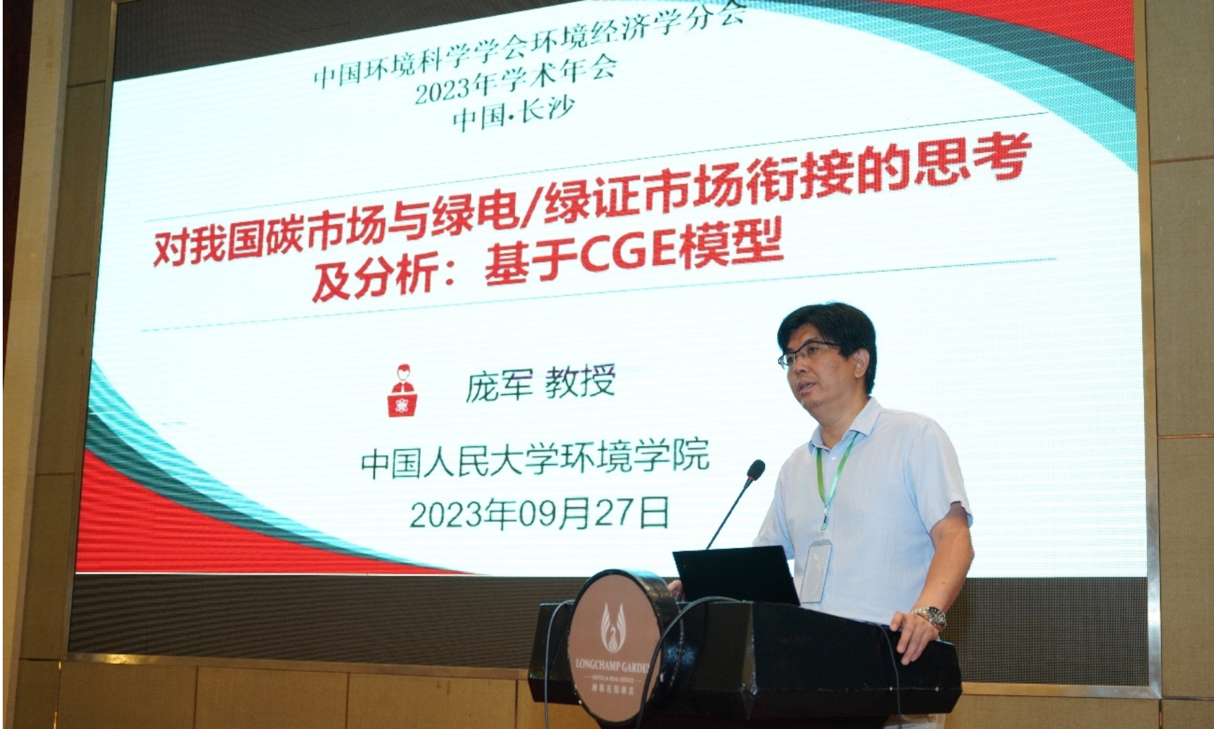 在上午的大会主旨报告环节,环境分分28预测 院长庞军教授应邀作题为《对我国碳市场与绿电/绿证市场衔接的思考及分析:基于CGE模型》的学术报告,分析了碳交易-碳税组合碳定价机制、引入CCER交易及抵消机制、碳市场-绿电/绿证交易市场衔接机制的经济影响及减排效果,并基于分析结果指出我国应从三方面促进碳交易与其他市场机制协同发挥作用:一是建立碳交易-碳税组合碳定价机制。在保持宏观税负稳定的前提下,通过企业税负结构的调整推动企业节能减排;适度引入碳配额拍卖机制,逐步减少免费配额发放并扩大配额拍卖比例。二是引入CCER交易及抵消机制。适时重启CCER项目审批与备案工作,从紧设置全国碳配额总量目标。三是建立碳市场-绿证交易市场衔接机制,采取有效措施避免重复计算CCER和绿证减排量。另外,生态环境部环境规划院政策所副所长董战峰研究员、浙江农林大学生态文明研究院院长沈满洪教授、昆山杜克大学张俊杰教授、湖南省环境保护科学研究院环境与经济研究所所长石广明研究员也分别作了主旨发言。