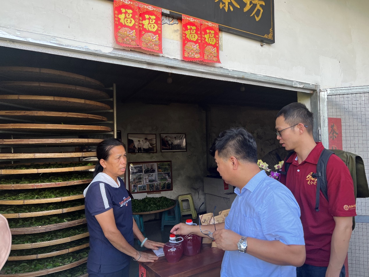 调研团了解到,毛纳村大部分村民以农业种植收入为主要收入来源,种植作物以茶叶、槟榔、橡胶、油茶为主。近年来,毛纳村农民人均可支配收入逐年递增,在2021年已达到15000元/人,同时增速趋稳,体现了乡村振兴和脱贫攻坚的显著成果。随后,调研团来到制茶手工坊、农户家中考察当地的产业发展。制茶手工坊中的村民正为炒茶忙碌,农户家门口整齐摆放着米酒、姜酒、槟榔、红茶等农产品,以供游客挑选购买。