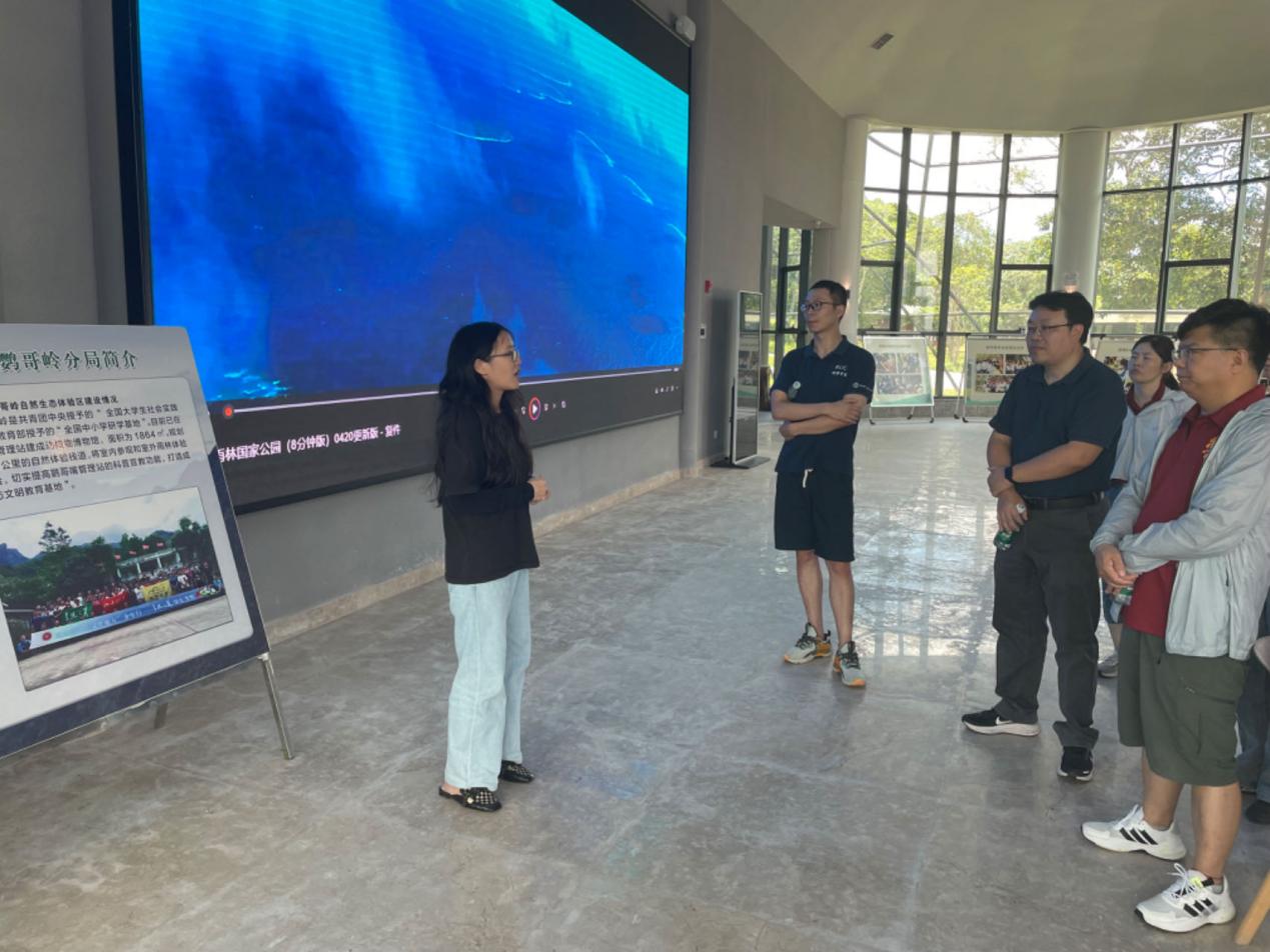 工作人员为调研团队介绍国家公园鹦哥岭片区发展现状