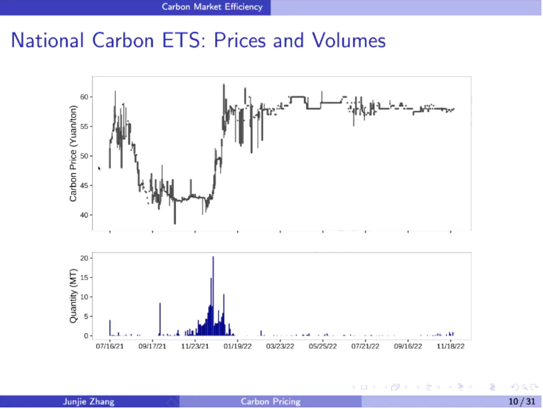 基于此,张俊杰主任的研究团队从中国碳市场的有效性和碳市场与企业竞争力之间的因果关系两个方面出发,开展了一系列深入研究。通过梳理全国碳市场的交易价格和交易量,张俊杰主任的研究团队发现我国的碳市场具有明显的履约市场特征,大部分交易均发生在企业年底清缴碳配额前夕,而其余时间段的交易活跃度则相对较低。针对有效市场假说的几个检验结果表明,我国的碳价不是一个随机游走过程,具有较强的可预测性,同时与煤炭价格表现出显著的负相关关系,而与石油价格和沪深300指数表现出显著的正相关关系。