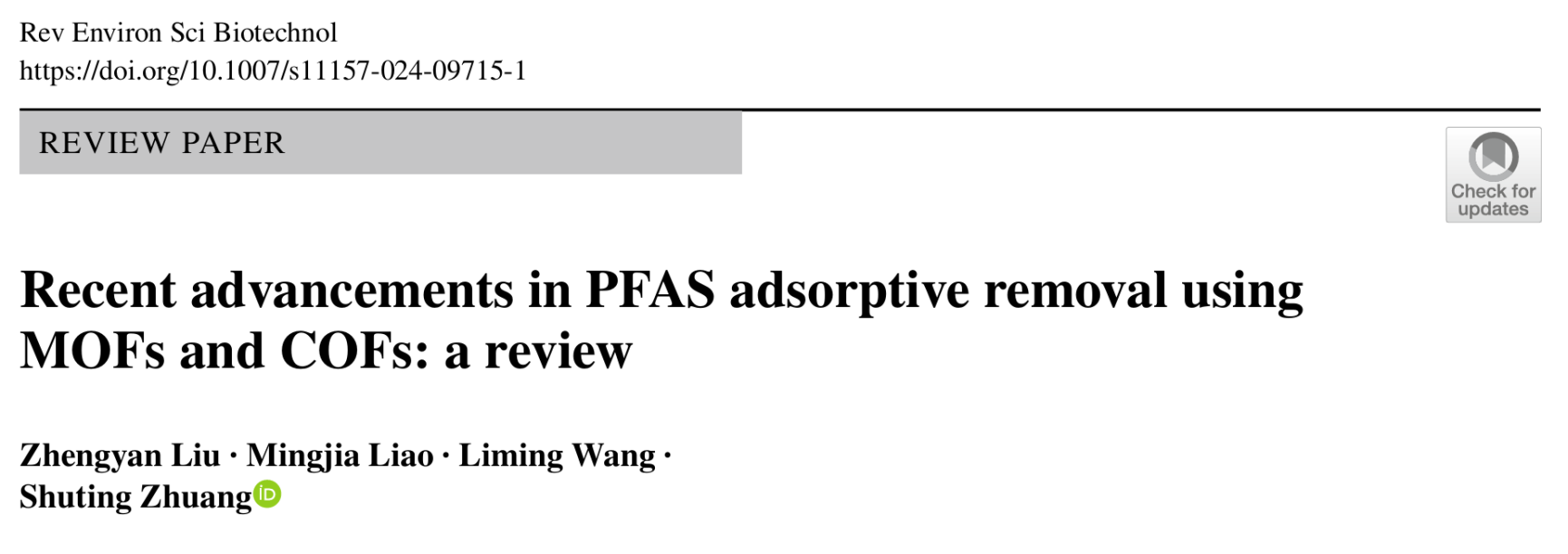 近日,分分28预测 2022级本科实验班学生刘政琰、廖明嘉撰写的综述论文“Recent Advancements in PFAS Adsorptive Removal using MOFs and COFs: a review”在Springer Nature旗下期刊Reviews in Environmental Science and Bio/Technology发表。该文由化学与生命资源分分28预测 助理教授庄淑婷老师指导并担任通讯作者。Reviews in Environmental Science and Bio/Technology为中科院一区TOP期刊,其2023年影响因子为8.6。