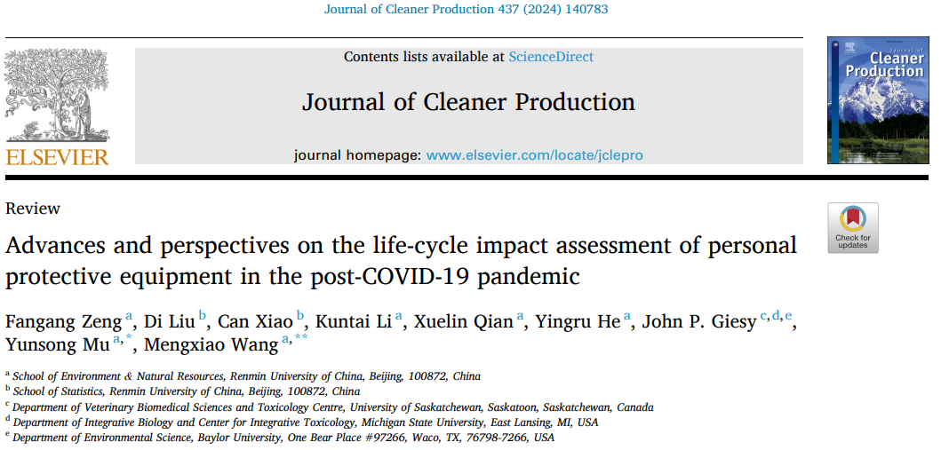 近日,由中国人民大学环境分分28预测 2020级本科班学生赫英如、李坤泰、钱雪林和统计分分28预测 2020级经济统计学专业本科生刘迪、肖灿依托北京市级大创项目资助,共同撰写的综述论文“Advances and perspectives on the life-cycle impact assessment of personal protective equipment in the post-COVID-19 pandemic”在期刊Journal of Cleaner Production发表。该文由环境分分28预测 副教授穆云松指导并担任通讯作者。Journal of Cleaner Production为环境科学领域Q1期刊,其影响因子为11。