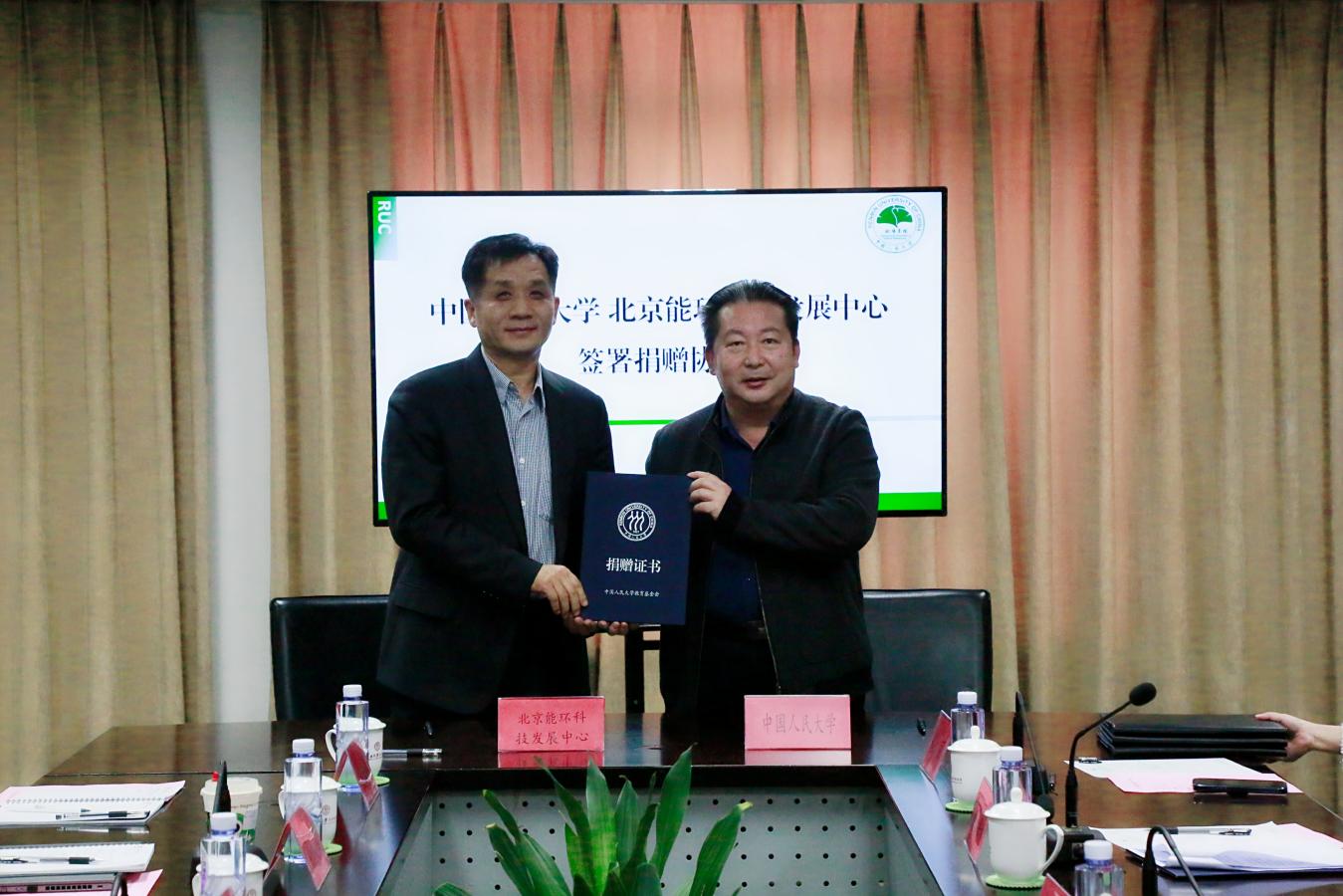 中国人民大学教育基金会秘书长郭海鹰代表学校基金会与北京能环科技发展中心主任刘昕签署了捐赠协议,并为刘昕先生颁发捐赠证书。