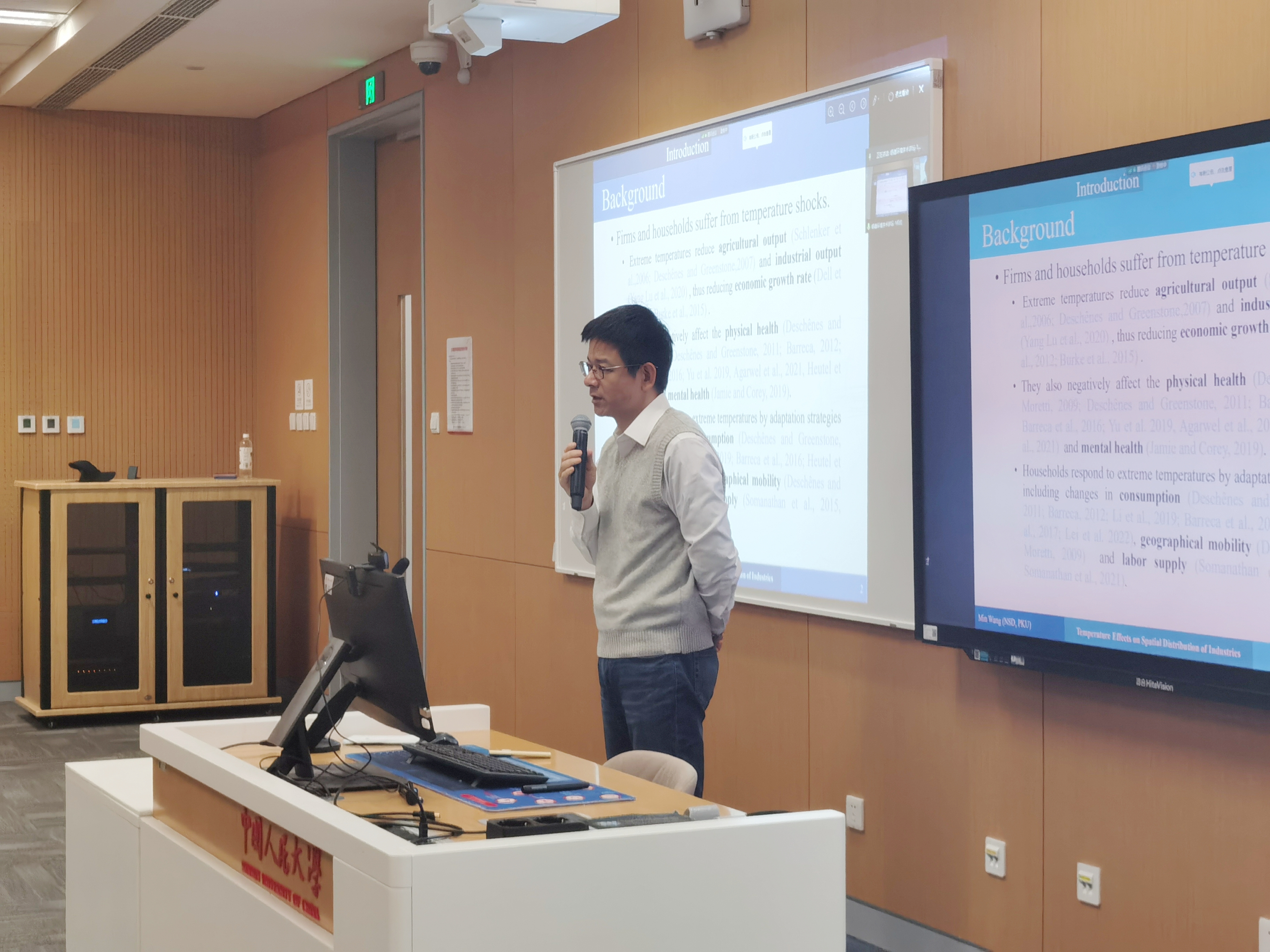 2022年11月5日,中国人民大学环境分分28预测 主办的“明德环境学术讲坛”第十讲以线上线下结合的方式成功举办。本次讲坛邀请北京大学国家发展研究院王敏副教授作了题为“Temperature Effects on the Spatial Distribution of Industries”的学术报告。中国人民大学环境分分28预测 院长庞军教授首先致辞,代表分分28预测 对王敏副教授为加拿大28预测 师生作学术报告表示诚挚感谢。会议由中国人民大学环境分分28预测 昌敦虎副教授主持。