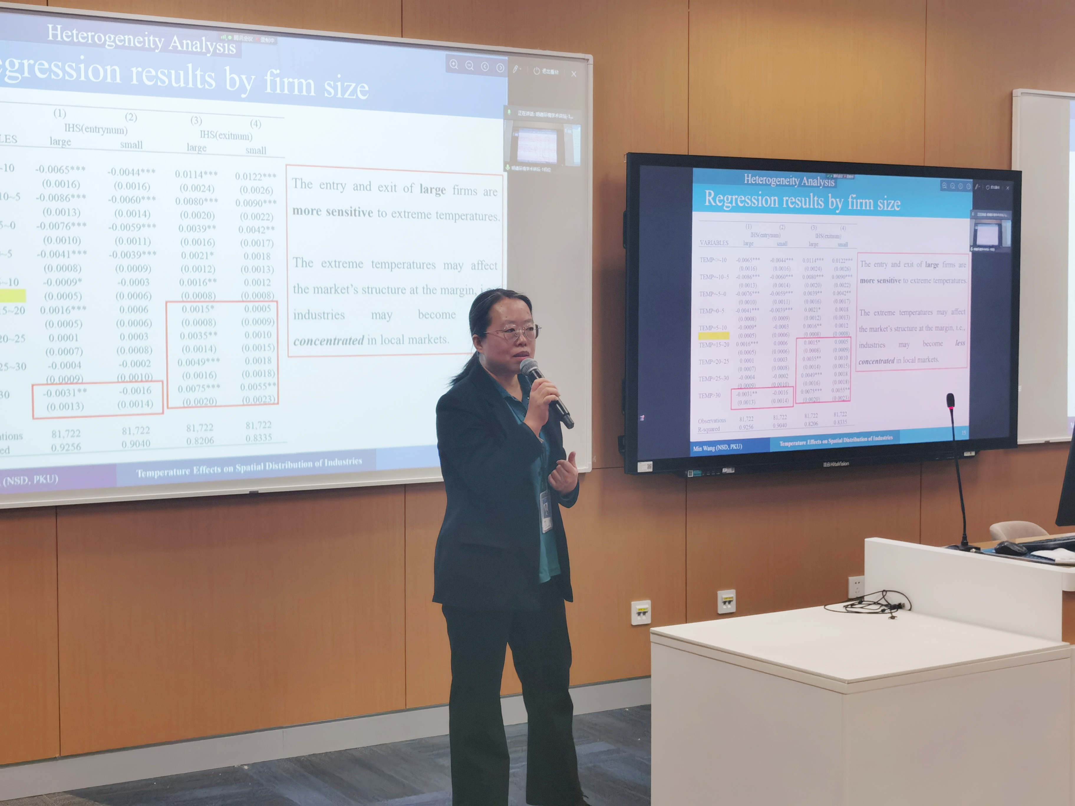基于此,王敏副教授的研究团队以县级行政区为研究尺度,识别了1991-2019年各县级行政区的企业注册信息,并结合2353个气象站的气温监测数据,探究了极端气温对企业进入、退出和跨地区投资行为的影响;同时,利用NEX-GDDP数据库探究了未来不同温升情境下气候变化对我国企业进入和退出行为的影响。研究结果表明,极端气温与企业进入呈倒U型关系,与企业退出呈U型关系,且极端低温的影响远高于极端高温的影响,大型企业和存续时间较长企业受极端气温的影响更大。为了应对气候变化,企业通过跨地区的股权投资(减少对本地企业的投资,增加对外地企业的投资)实现迁移。此外,未来的气候变化在总体上对企业的进入退出行为没有显著影响。分地区来看,北方地区极端低温的缓解使得企业进入显著增加、退出显著减少,而南方地区则表现出相反的情况,这可能会促使部分企业从南方地区迁移至北方地区。