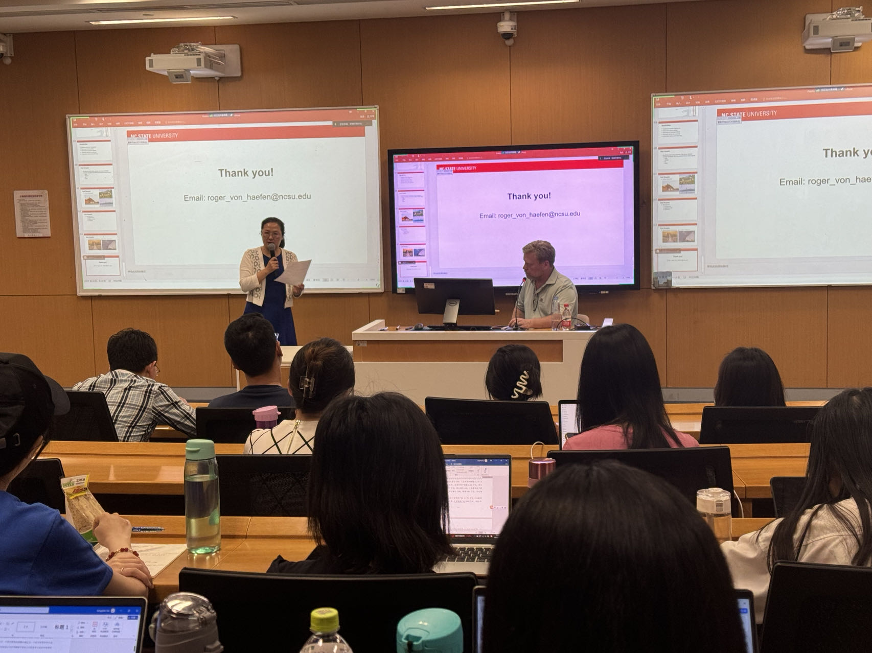 来自中国人民大学、清华大学、北京师范大学、复旦大学、浙江大学、南开大学、华中科技大学、中科院大学等多所国内外高校与科研机构的200余名师生参加了本次讲座。在报告结束后的讨论环节,多位师生围绕报告中的具体模型设定和方法论、报告研究方法在中国的应用、研究前沿及文章投稿注意事项等问题与Roger H. von Haefen教授进行了深入探讨,会场内气氛活跃,师生反响热烈。
