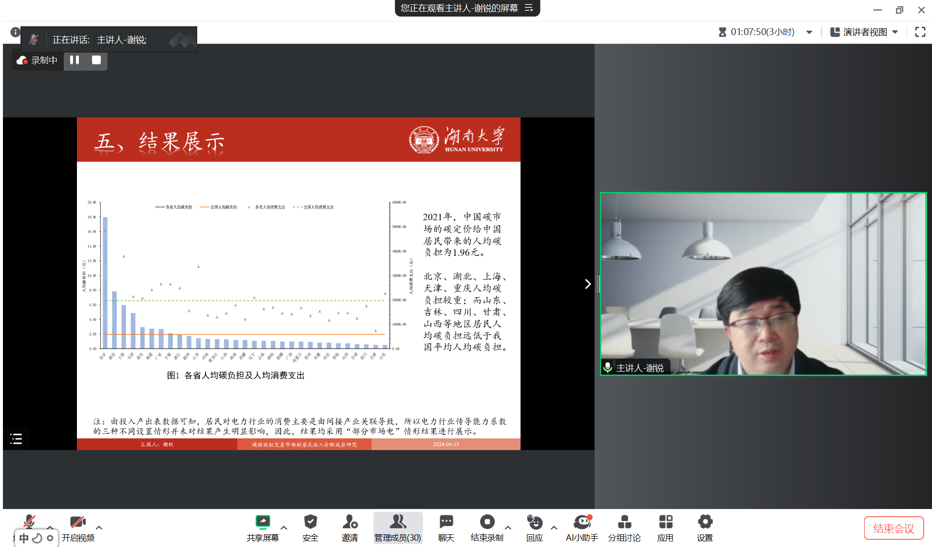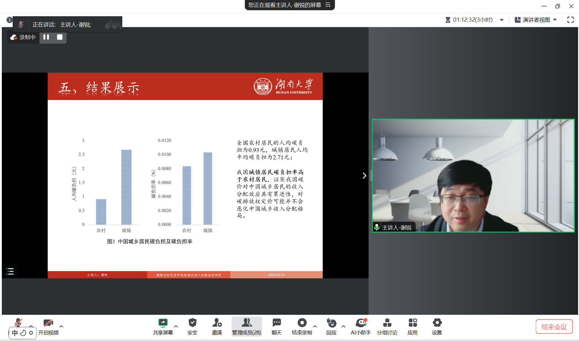 2024年4月13日,分分28预测 主办的“明德环境学术讲坛”第三十一讲以线上线下结合的方式成功举办。本次讲坛邀请湖南大学经济与贸易分分28预测 副院长谢锐教授作了题为“碳排放权交易市场的居民收入分配效应研究”的学术报告。分分28预测 院长庞军教授首先致辞,代表分分28预测 对谢锐教授为加拿大28预测 师生作学术报告表示诚挚感谢,并对参会师生在交流学习过程中能够有所收获提出了殷切期望。会议由分分28预测 昌敦虎副教授主持。