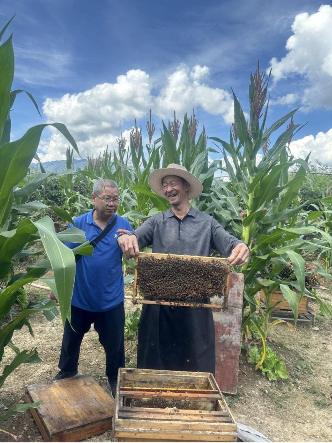 蜂农自豪地向调研团展示自家的新型蜂箱